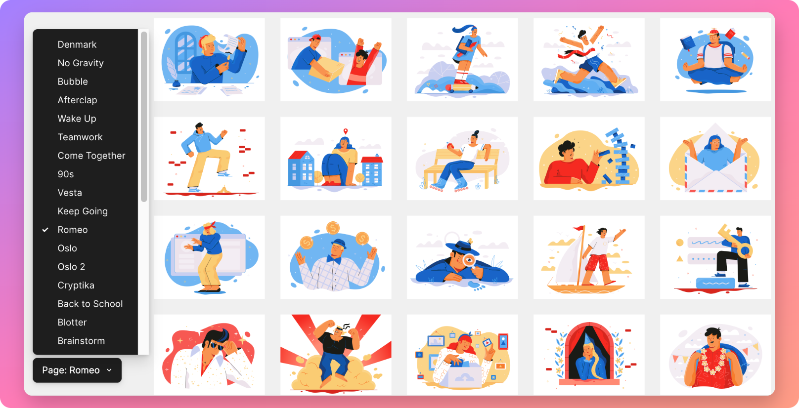 750+个插画,免费提供 1200×1200 的 PNG,没有修改需求的情况下作为插画够用了。