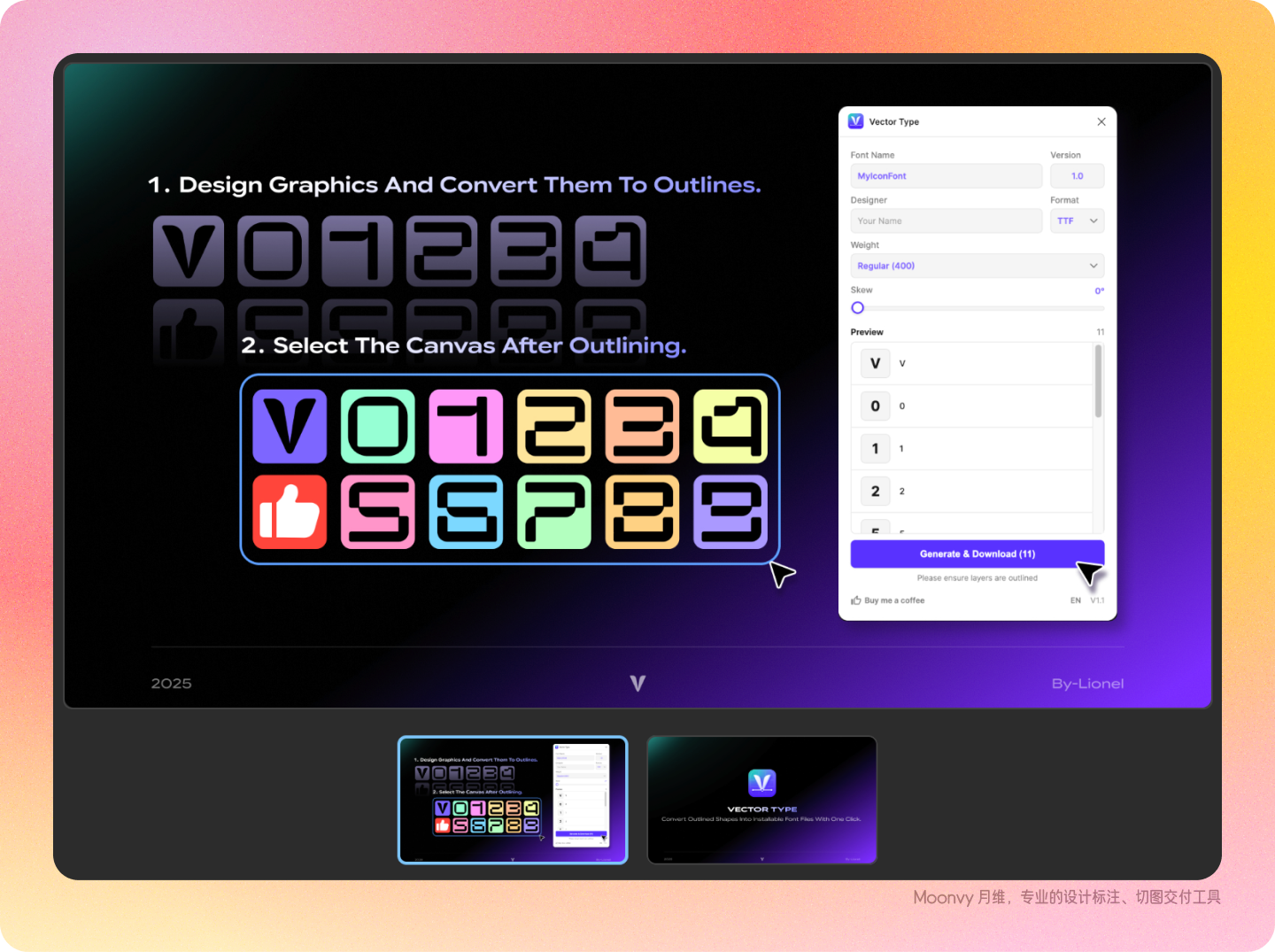 在Figma 内一键将你的矢量形状转换为可安装的字体包!可定义字体署名,可设置字体倾斜角度!