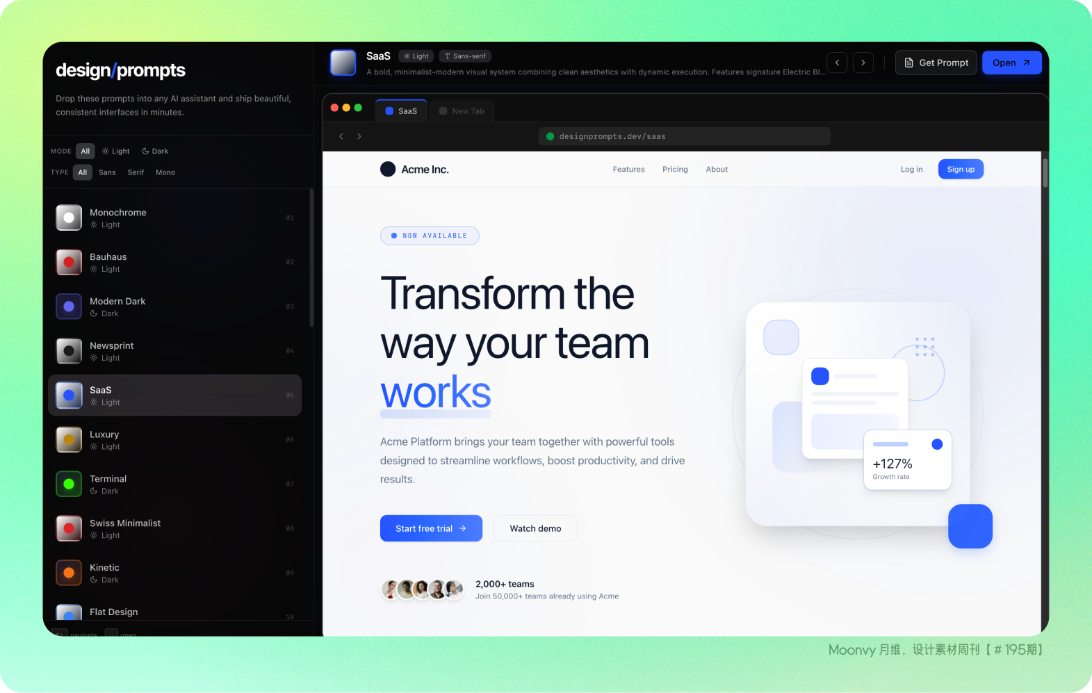 现在可以在网站中切换查看多种网站设计风格,复制喜欢风格的提示词,将这些提示添加到任何 AI 助手,即可在几分钟内打造美观且一致的界面。