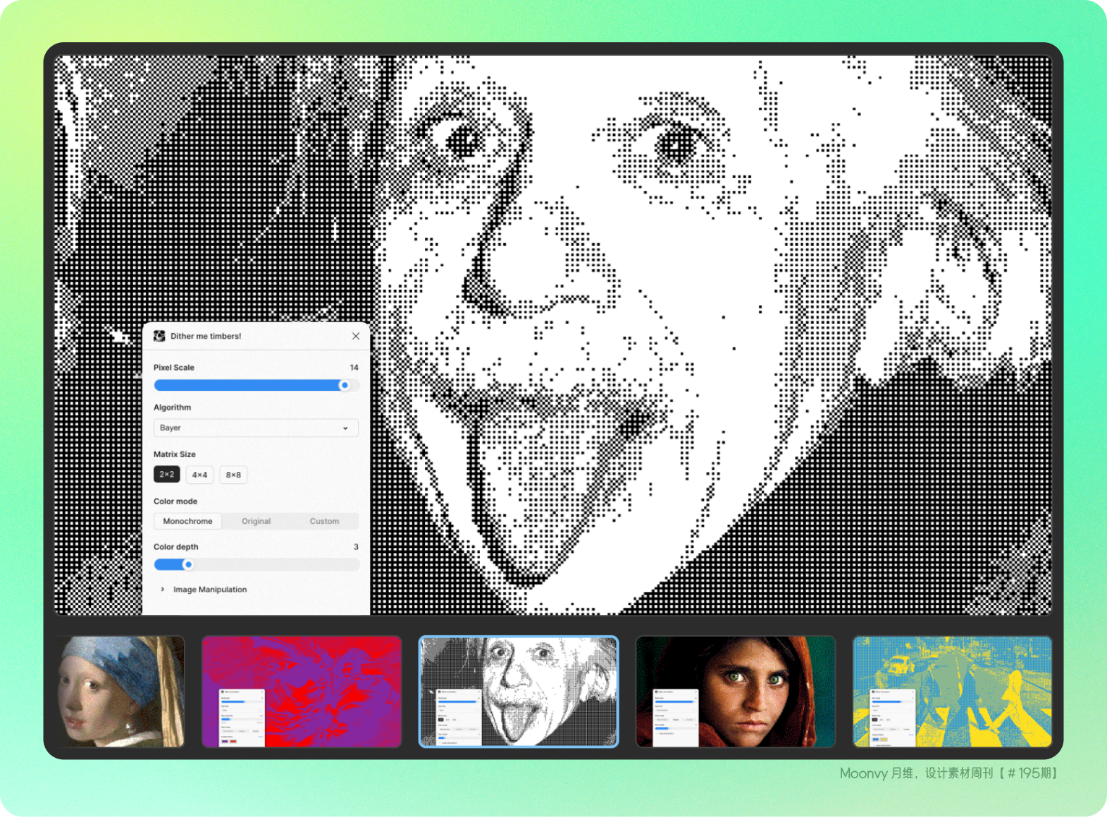 为图片添加多种 抖动(Dither)效果。应用效果后,插件会实时复制并更新最底部的图片图层,支持透明背景和复杂的矢量形状蒙版。仅支持 图片图层,无法直接将矢量图层转换为抖动图片效果