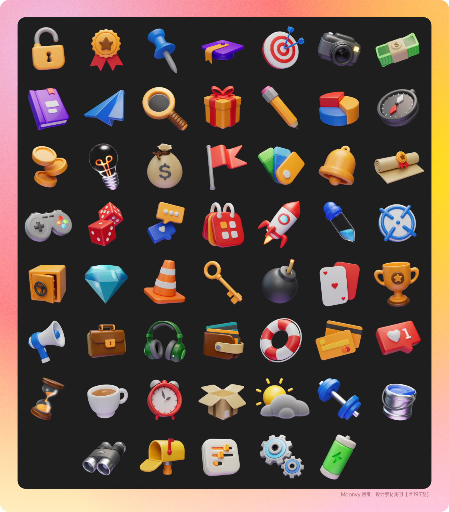 包含 50 多个 3D 图标的素材,使用 C4D 创建,并在 Photoshop 中进行精细化处理