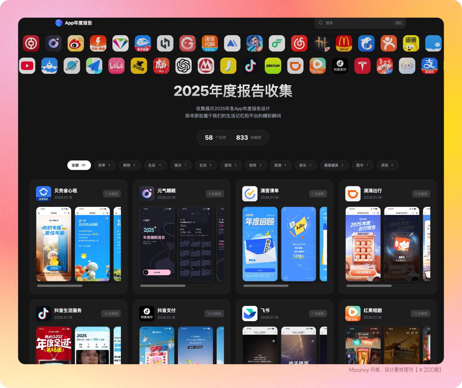 网站收集展示 2025 年各App年度报告设计,包含 58个应用 800+张截图