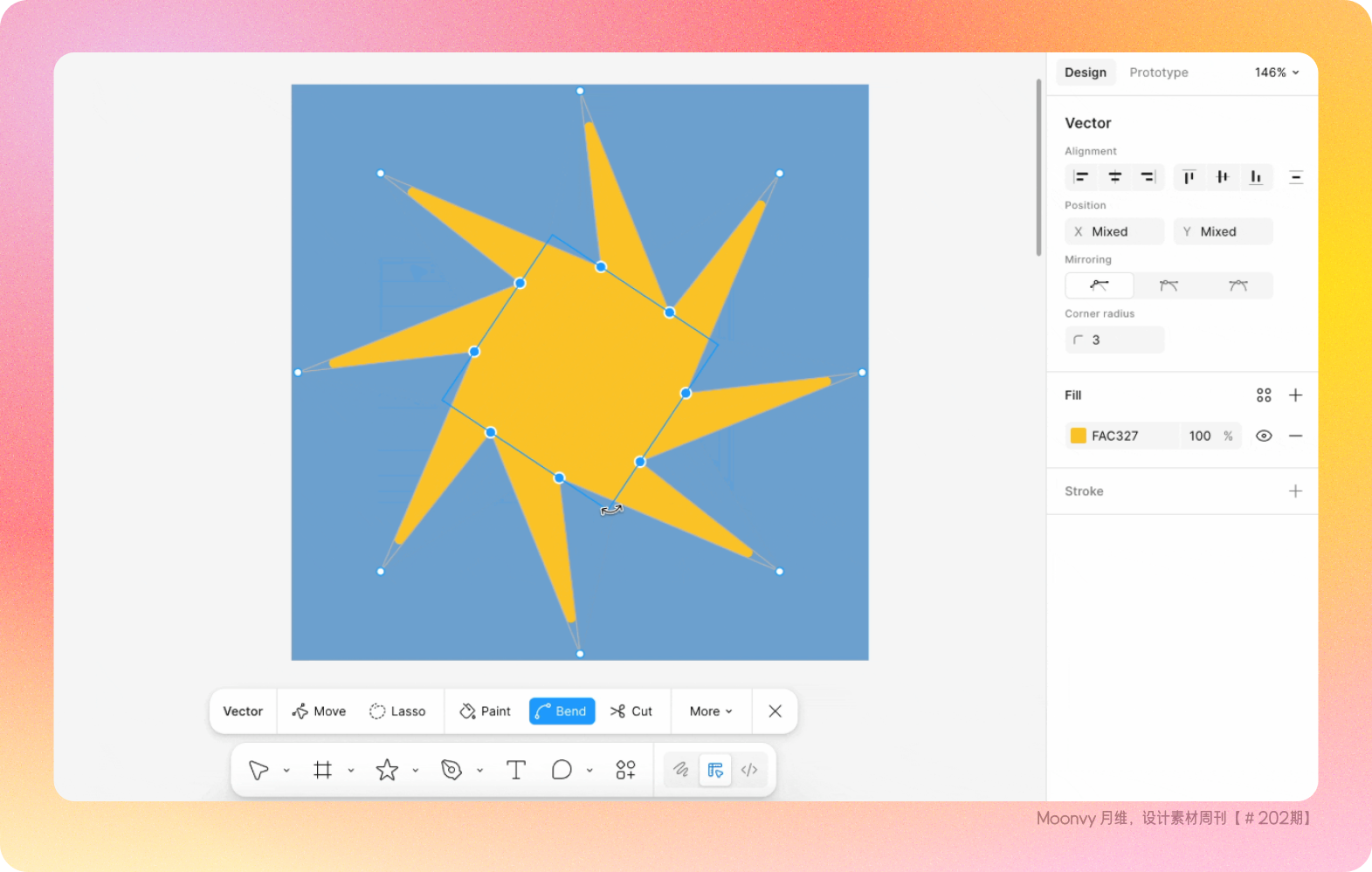 另外 Figma 支持了矢量锚点多选编辑功能,选中多个矢量点后,会出现一个边界框,可以批量的旋转、调整大小和平移这些矢量点。