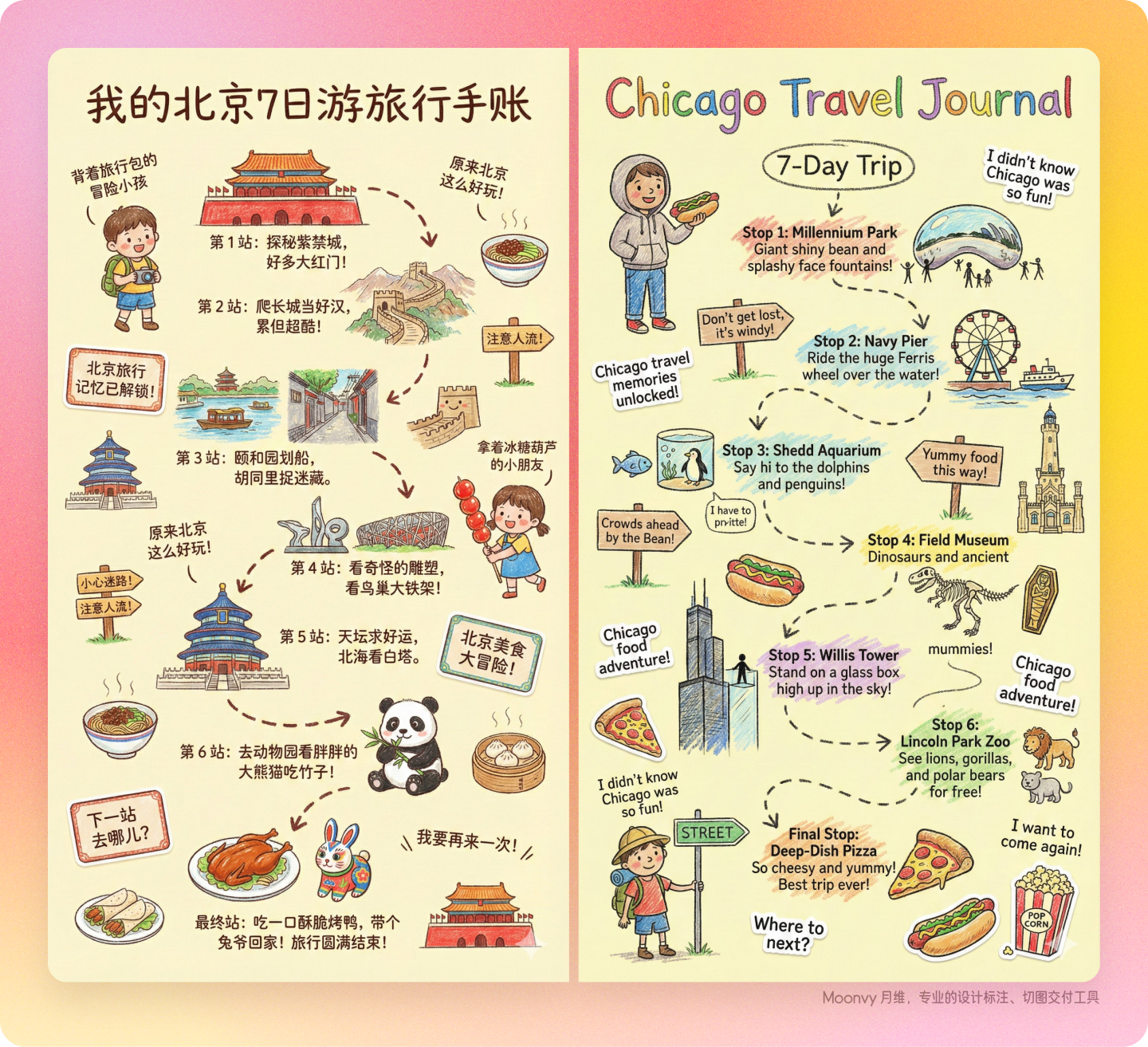 让整页像是小朋友的旅行日记手绘作品