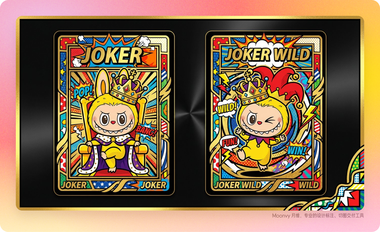 - "JOKER" text with Pop Art gold frame featuring bold, colorful elements