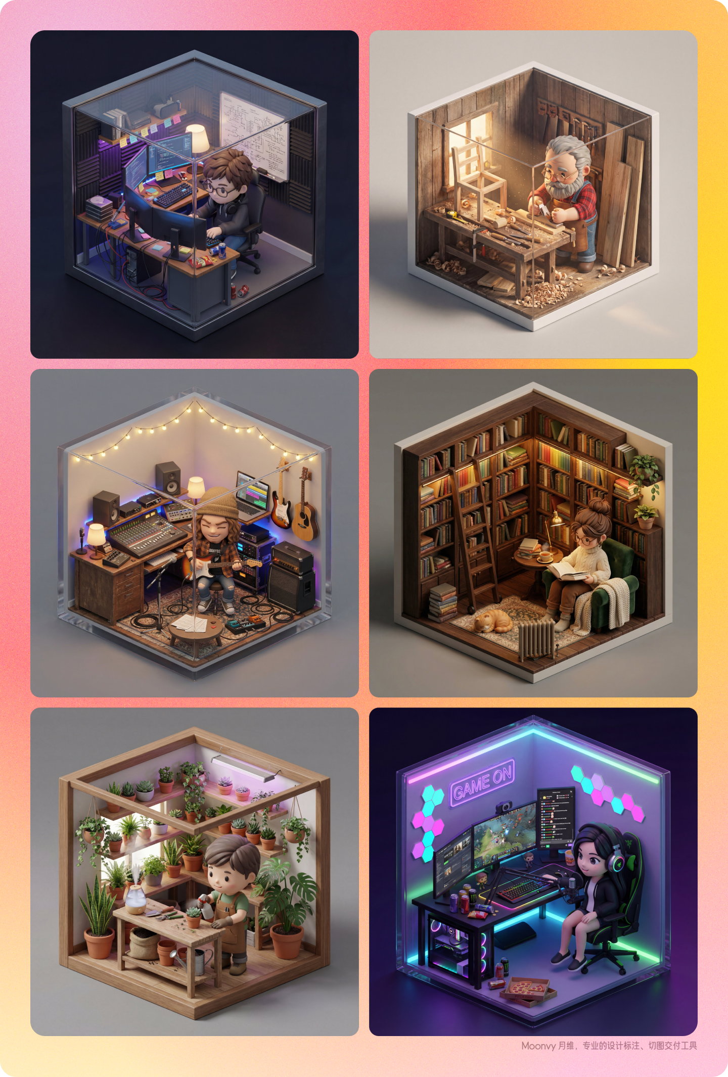 一个等距3D立方体形状的微缩房间,房间描述、角色描述、角色动作、表情、人物材质、光照、拍摄角度、背景、构图等描述