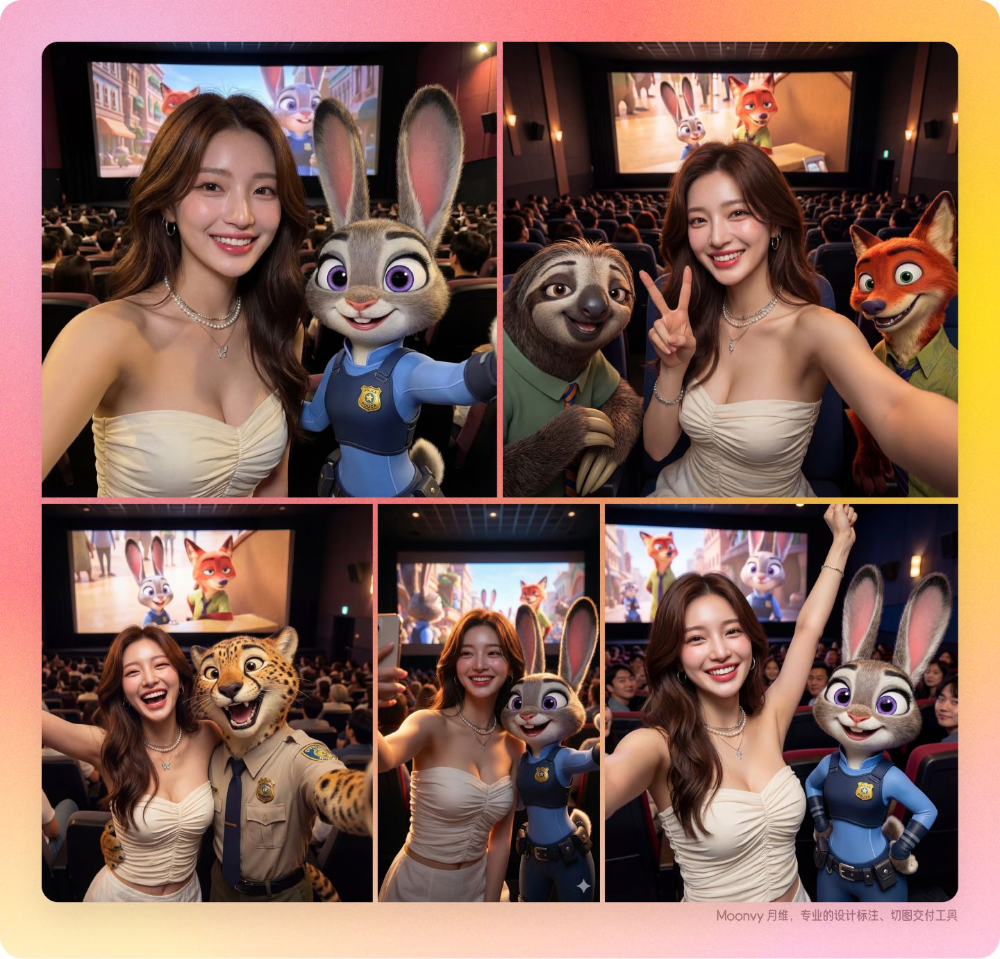 场景:黑暗拥挤的电影院。背景有大屏幕播放疯狂动物城电影场景。电影般的灯光,温暖的环境光。