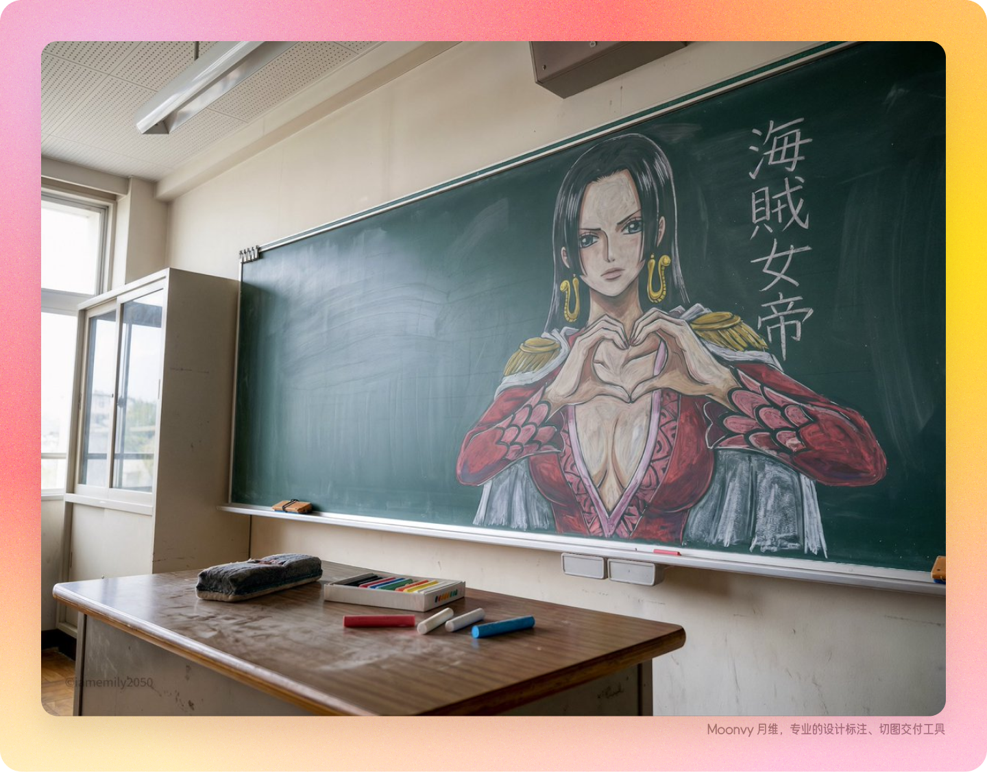 "primary_subject": "一幅画在典型绿色教室黑板上的大尺寸、细致的《海贼王》角色“波雅·汉库克(Boa Hancock)”粉笔画。",