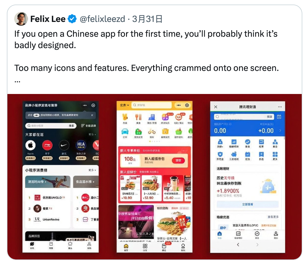 所以你可以在类似 Uber 的打车 App(滴滴打车) 中贷款、开信用卡、买保险、叫家政。在类似 Dropbox 的网络存储 App(百度网盘)中浏览网页、像 Netflix 一样看电影、像 TikTok 一样看短视频、甚至求职。