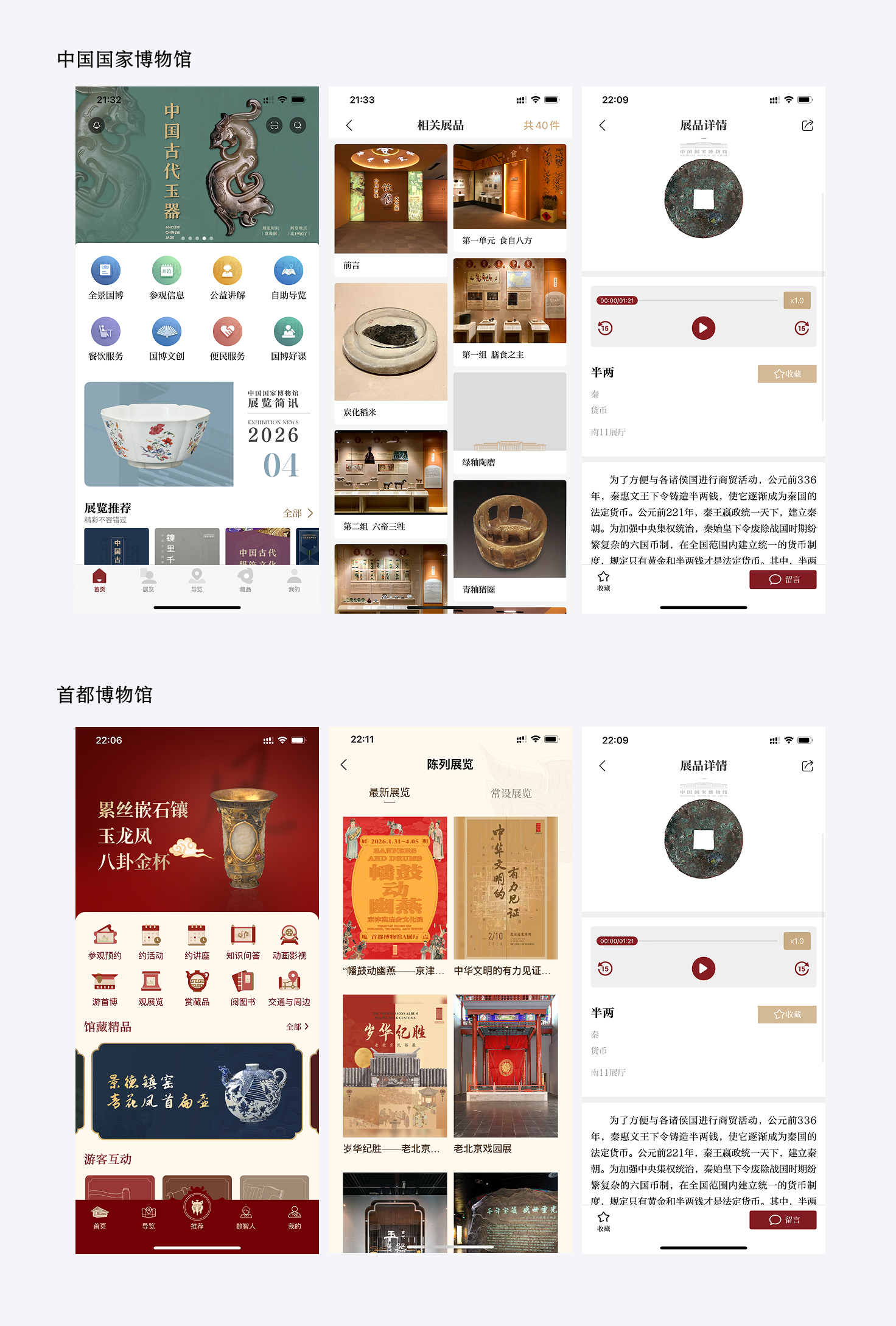 我们可以看到,在中国的博物馆 App 的界面设计相比商业 App 简洁一些,但不多,但仍然保留了较高的信息密度和复杂性。
