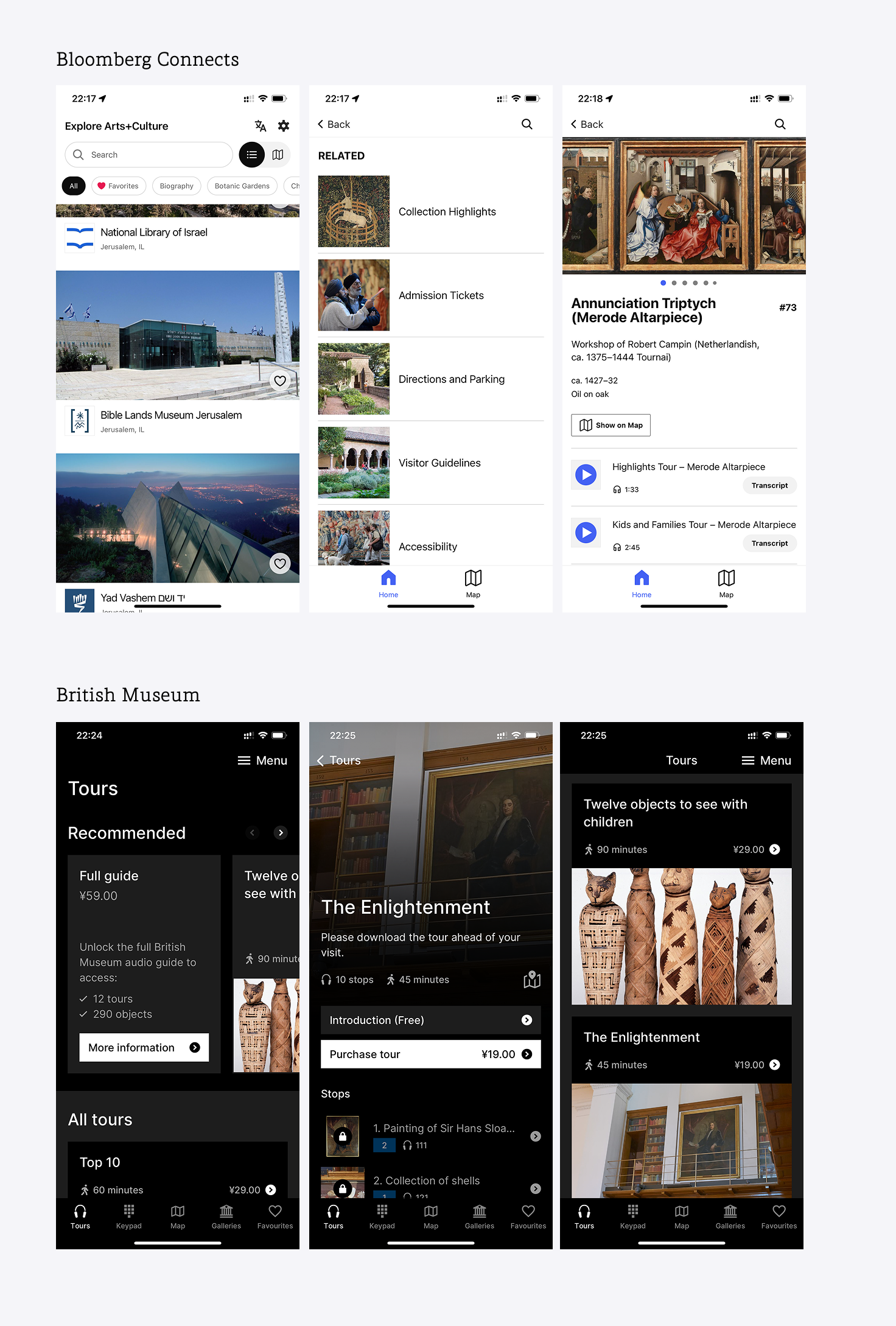 这里我们选取了中国国家博物馆、首都博物馆的官方 App 与西方常用的博物馆 App Bloomberg Connects、British Museum 来对比一下。