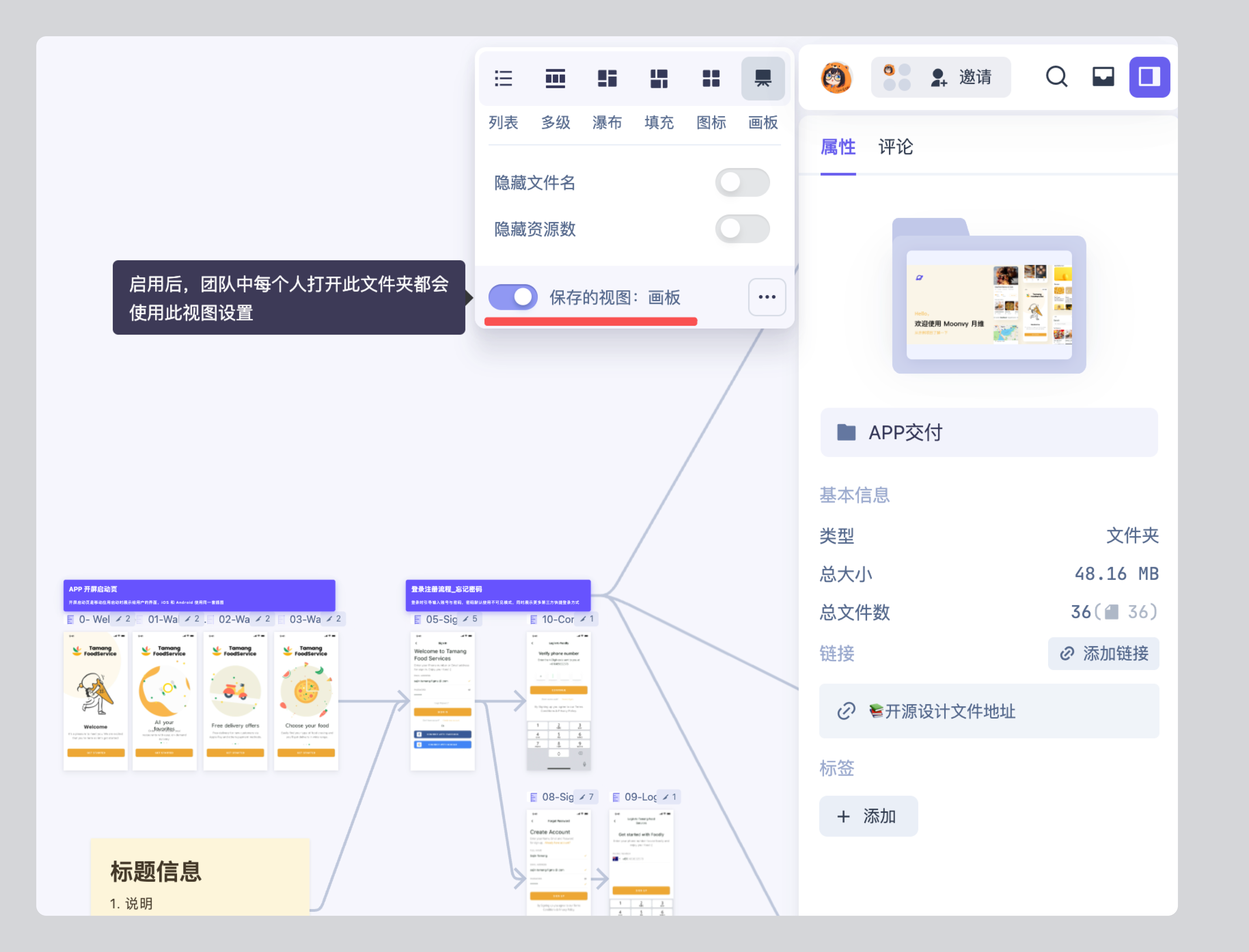 在画板视图中,可以为设计图添加『逻辑连线』和『便签』更直观的方式展示设计图之间的关系