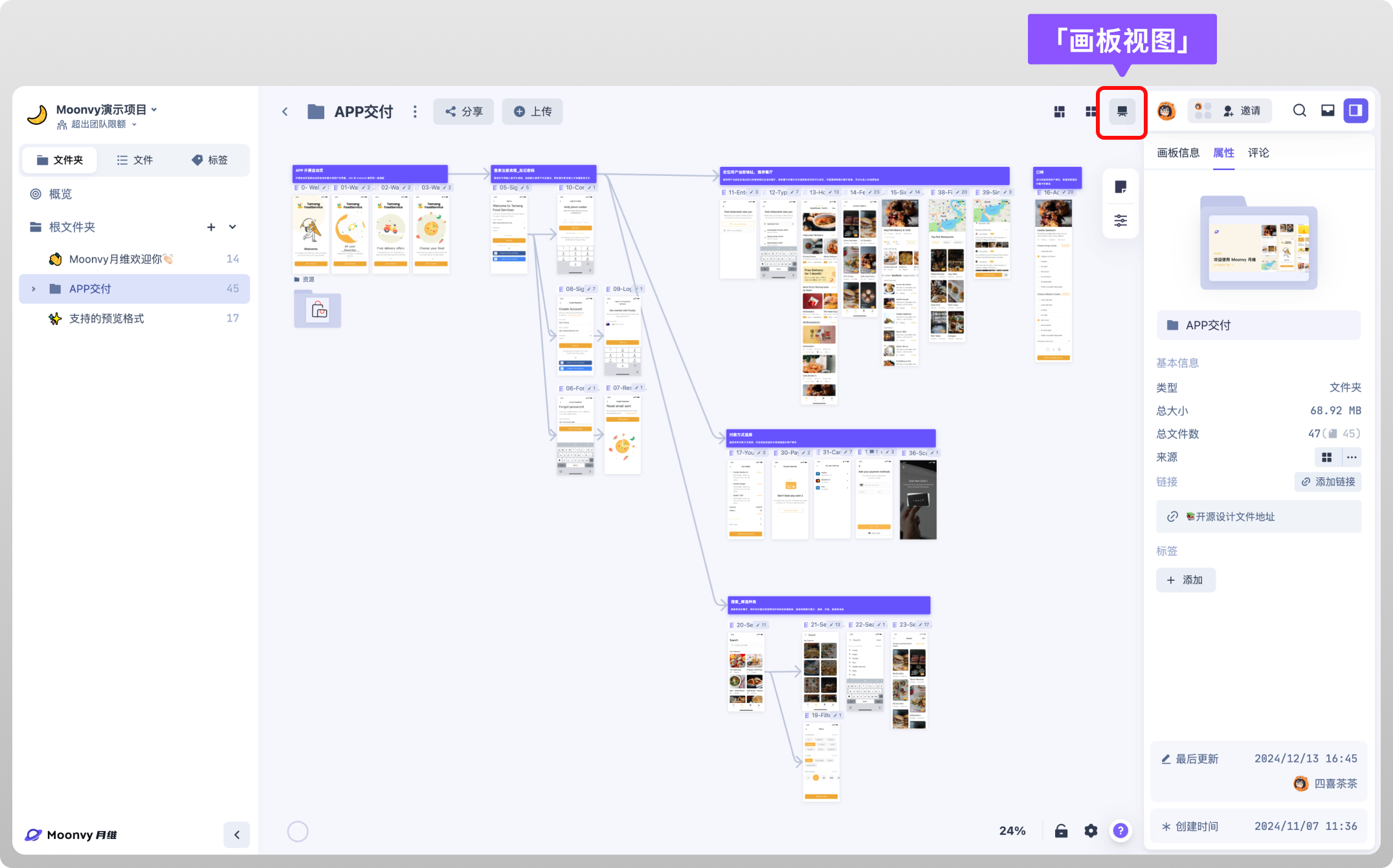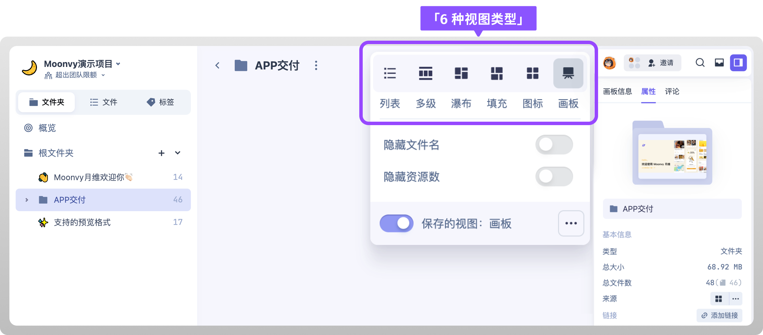 视图介绍 在月维中,每个文件夹都可以根据文件内容修改视图,提供六种不同的文件展示方式 列表: 以列表方式展示小缩略图,更多展示文件的类型、尺寸等信息; 多级: 适合跨文件夹看子层级文件,有大小两个规格; 瀑布流:配合隐藏标题,适合连续预览文件,适合素材类的图片预览; 填充:横向对齐设计图,适合连续预览文件,适合素材类的图片预览; 图标: 适合一次预览较多文件,有大小两个规格; 画板: 设计图平铺在一起,适合看结构和逻辑。 画板视图 相关文章如何选择设计图倍数Moonvy 服务协议接下来看看Figma 年度报告 2025/12/31月维新增设计图字体下载功能 2026/01/04AI Prompt 2025/11/302025 年主流设计交付工具全面对比 2025/06/05免费替代 Axure Cloud!月维 Axure 原型托管 2025/02/21AI 工作流生成动态新年表情 2025/01/10