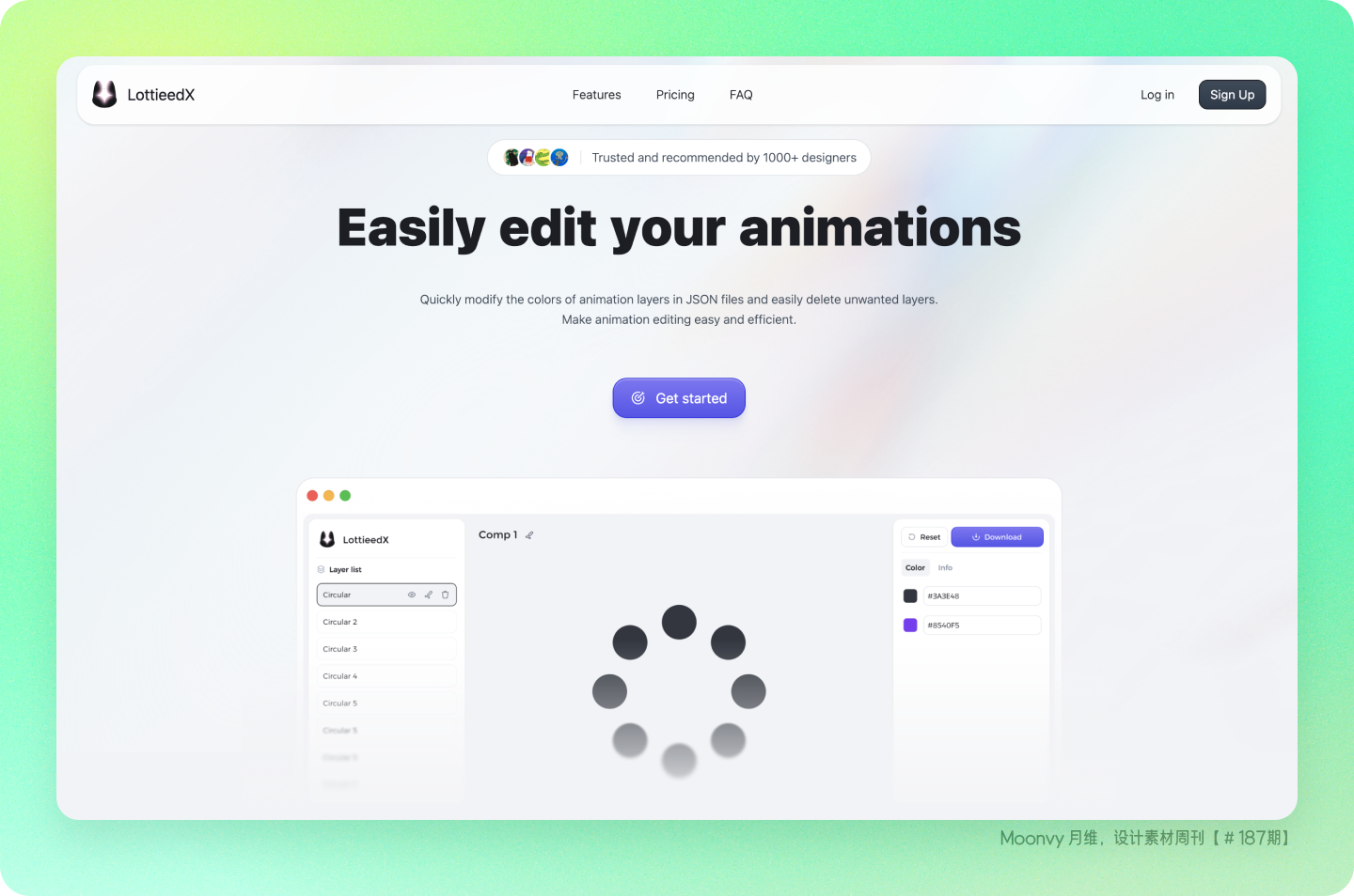 来自国内的开发者,快速修改 JSON 文件中动画图层的颜色,并轻松删除不需要的图层。让动画编辑变得轻松高效,同时上传你的 Json 动画可以将不需要的元素删除重新导出 Json 动画,目前完全免费
