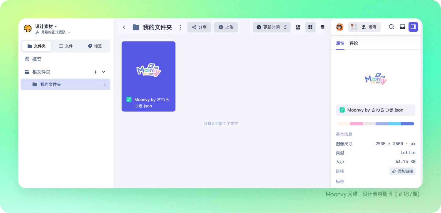 Lottie 类型的动画文件无法本地预览效果,可以将 JSON 动画文件上传到月维中进行预览,发给团队或者开发者,开发者可以在月维进行资源下载和使用