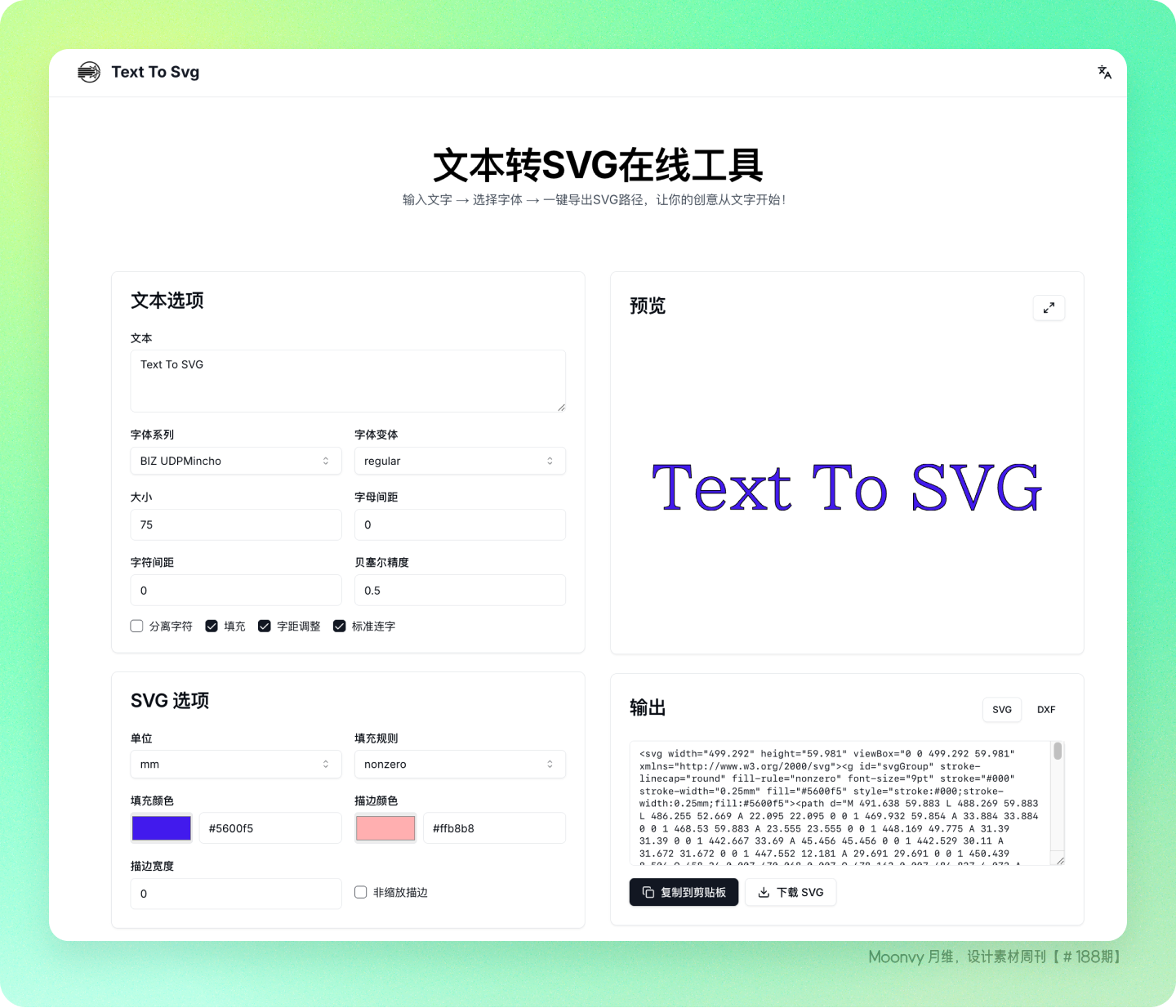 免费的在线文本矢量化工具,可将文字一键转换为 SVG 路径或 DXF 轮廓。内置 Google Fonts 字体库,支持实时预览、字符间距调整、连字控制等参数设置。
