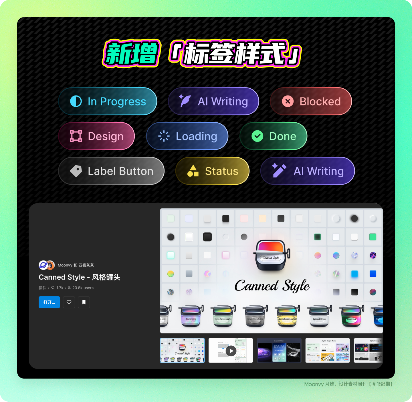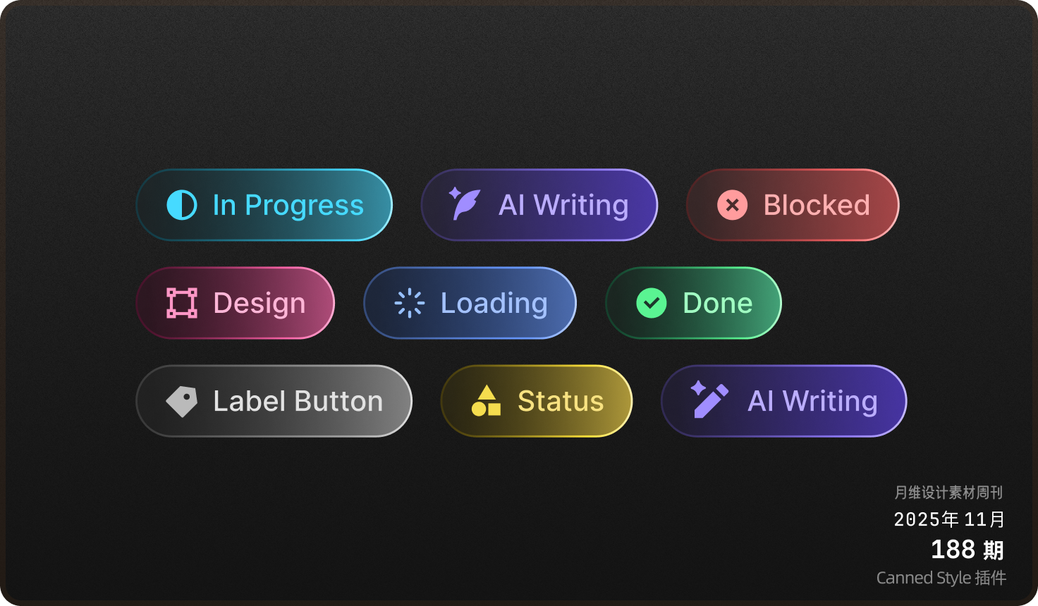 Figma 插件「Canned Style 风格罐头」迎来更新,本次增加了一组全新的黑暗标签样式,为设计师提供更多深色主题的样式选择,Canned Style 插件中已经包含几百种不同风格的样式了,欢迎大家免费使用。
