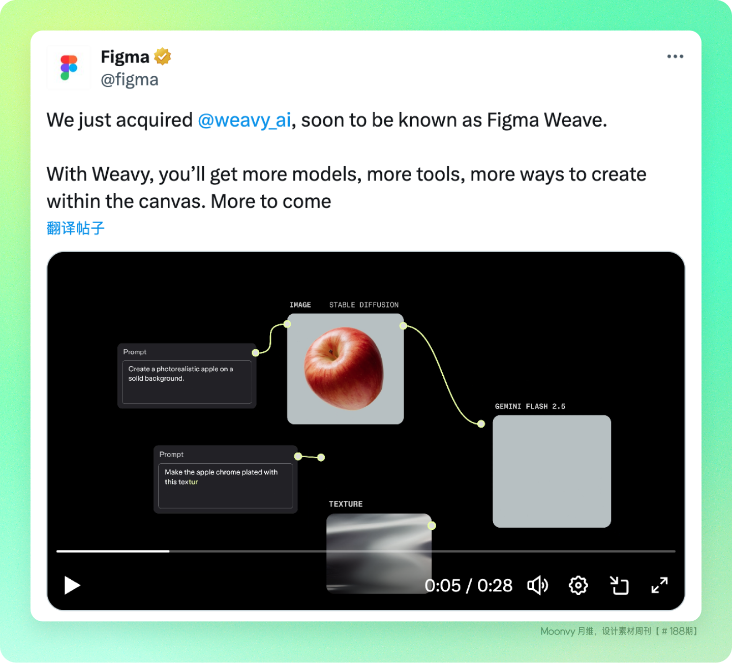 Figma 官方宣布收购 AI 设计工具 Weavy,将更名为 Figma Weave。此次收购将为 Figma 带来更多 AI 模型、更多工具和更多画布内创作方式,进一步增强 Figma 的 AI 能力,为设计师提供更强大的创作体验。