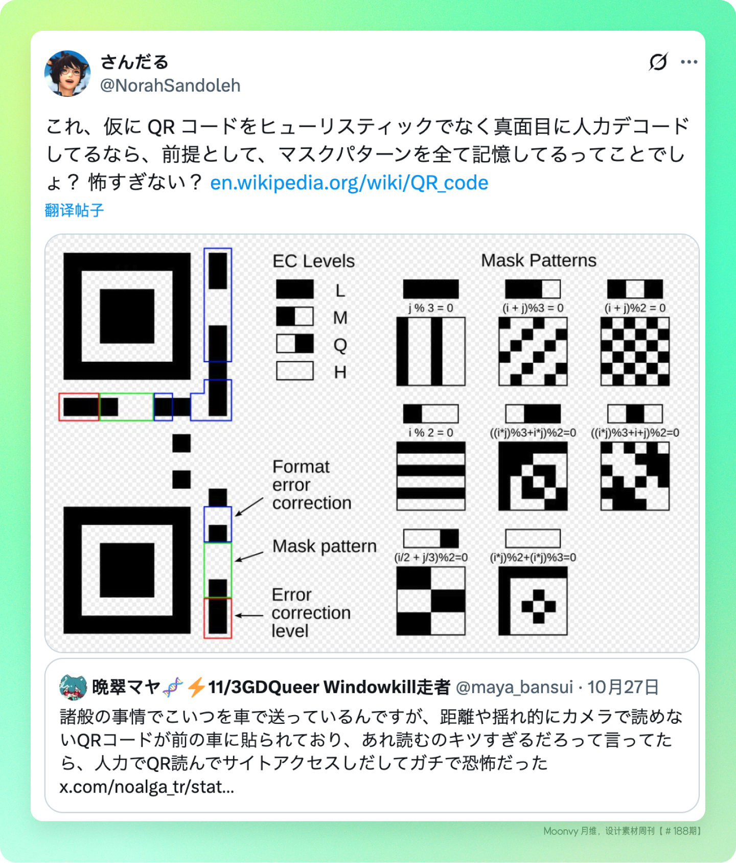 一条有趣的技术讨论:如果真的有人能够不借助工具、纯靠人力解码 QR 码,那意味着他们需要记住所有的掩码模式。这个话题引发了关于人类记忆能力和 QR 码编码原理的有趣讨论。