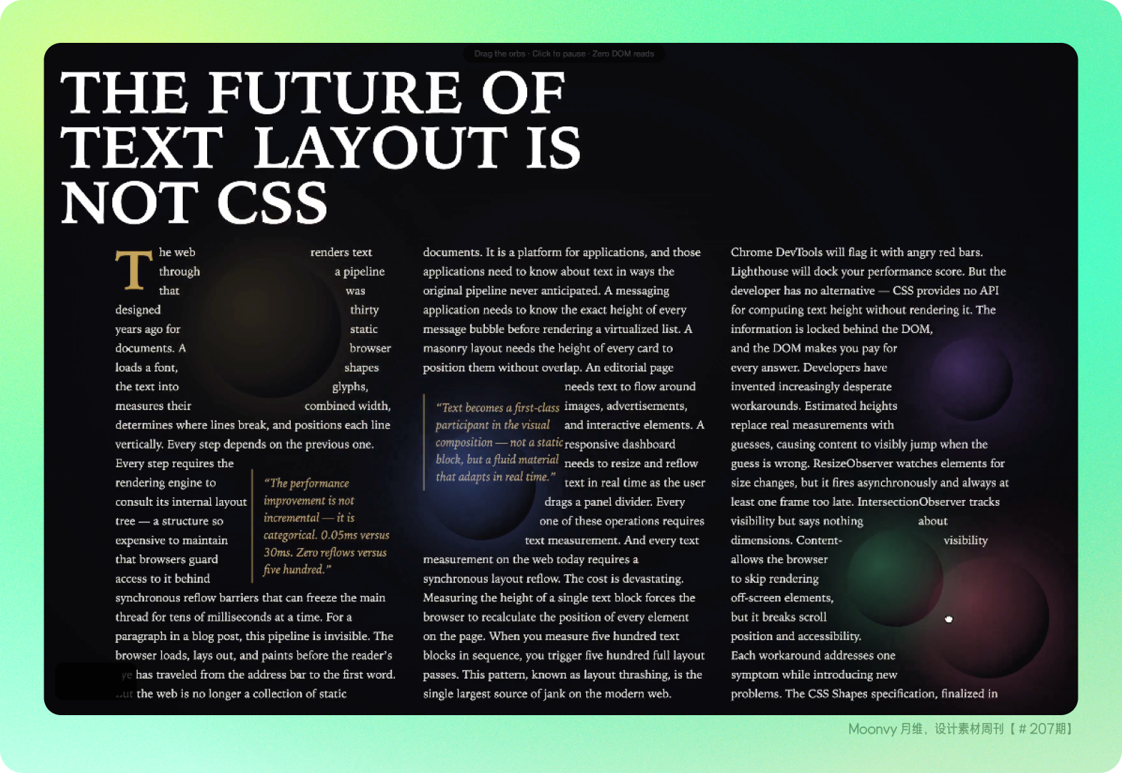 这是一个开源的文本排版项目,提供快速且高精度的文本测量与排版算法,可实现类似报纸版面的动态图文环绕与复杂排版效果。该方法也可作为 AI 的排版能力基础,让模型在生成网页或富文本内容时,能够更灵活、更可靠地完成布局与渲染决策,从而提升自动生成页面的可读性与美观度。