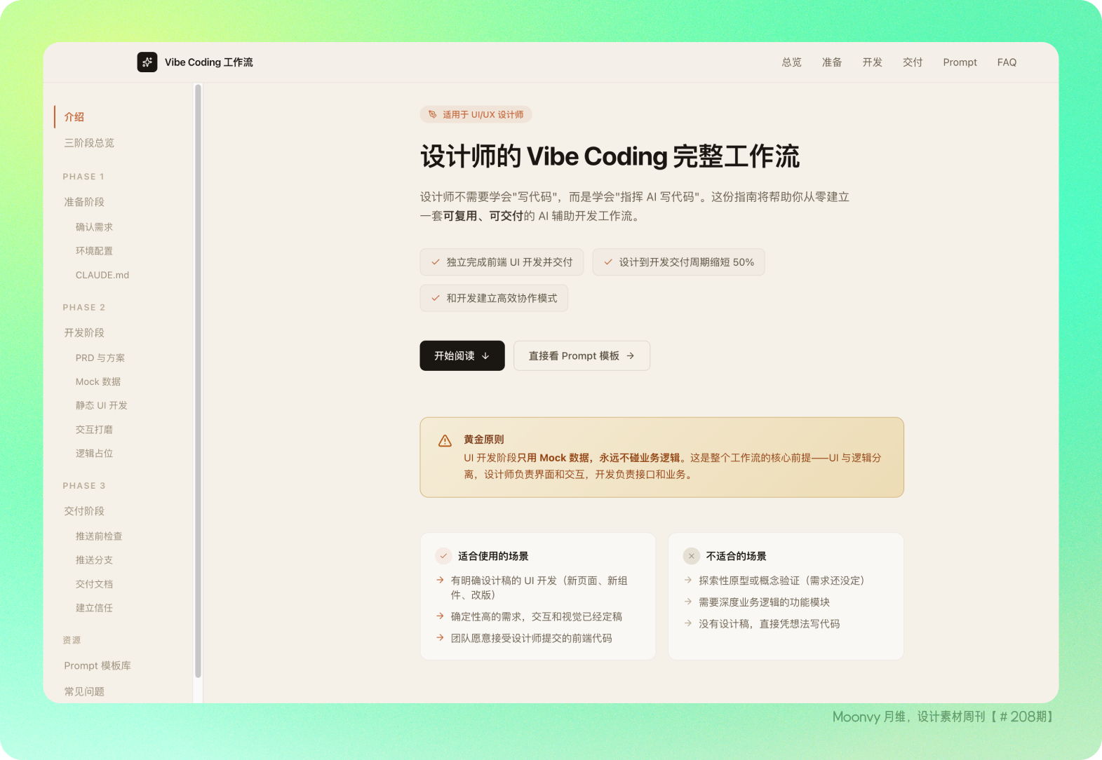 作者根据自身经验整理了一份「面向 UI/UX 设计师 的 Vibe Coding 完整工作流指南」从用 AI 辅助开发到 可交付、可上线。
