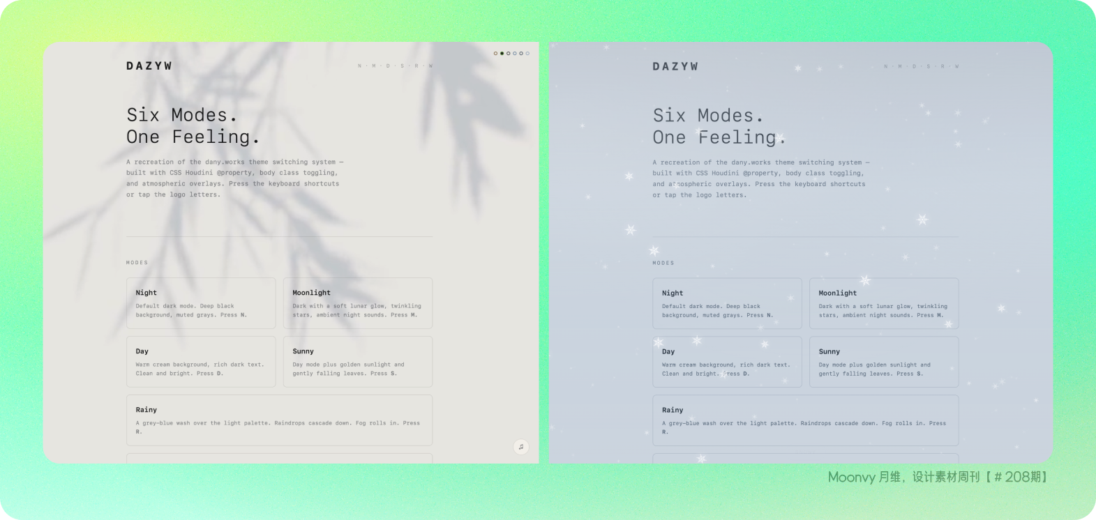 作者为自己的博客增加了多种阅读状态,让视觉外观不止是浅色、深色,增加了树影、月色、下雨、下雪等多种自然状态,网站右上角可以切换体验