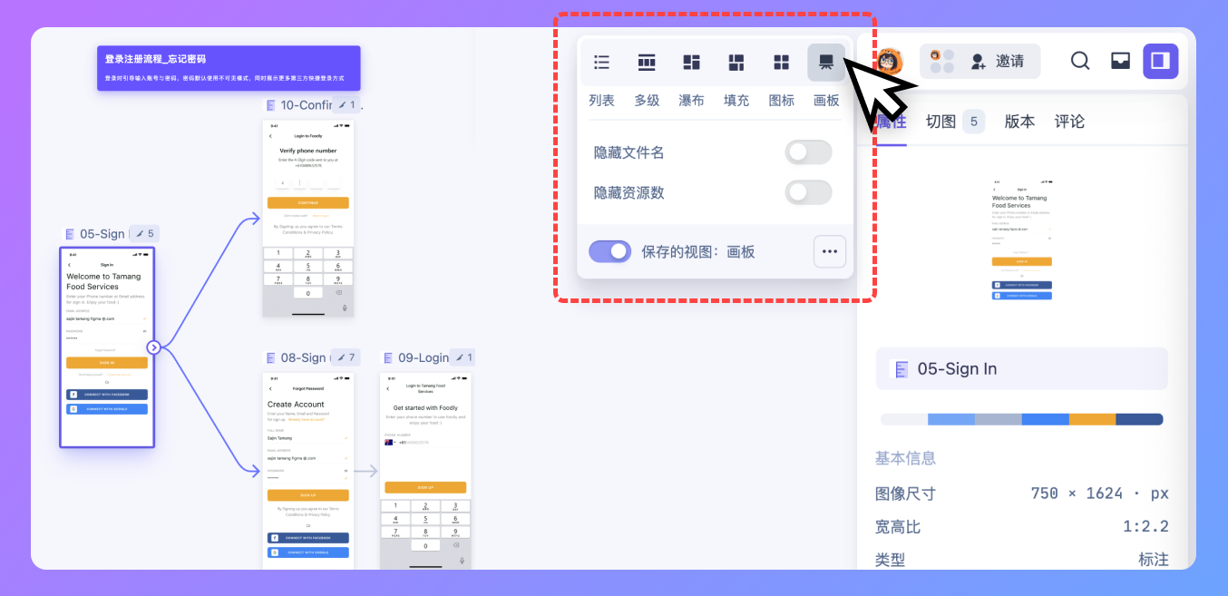 当文件夹未设置默认视图时,通过插件上传的设计图将自动以「画板」视图保存,无需额外配置,查看更直观;同时也支持通过右上角的视图切换,随时调整并保存为其他视图。